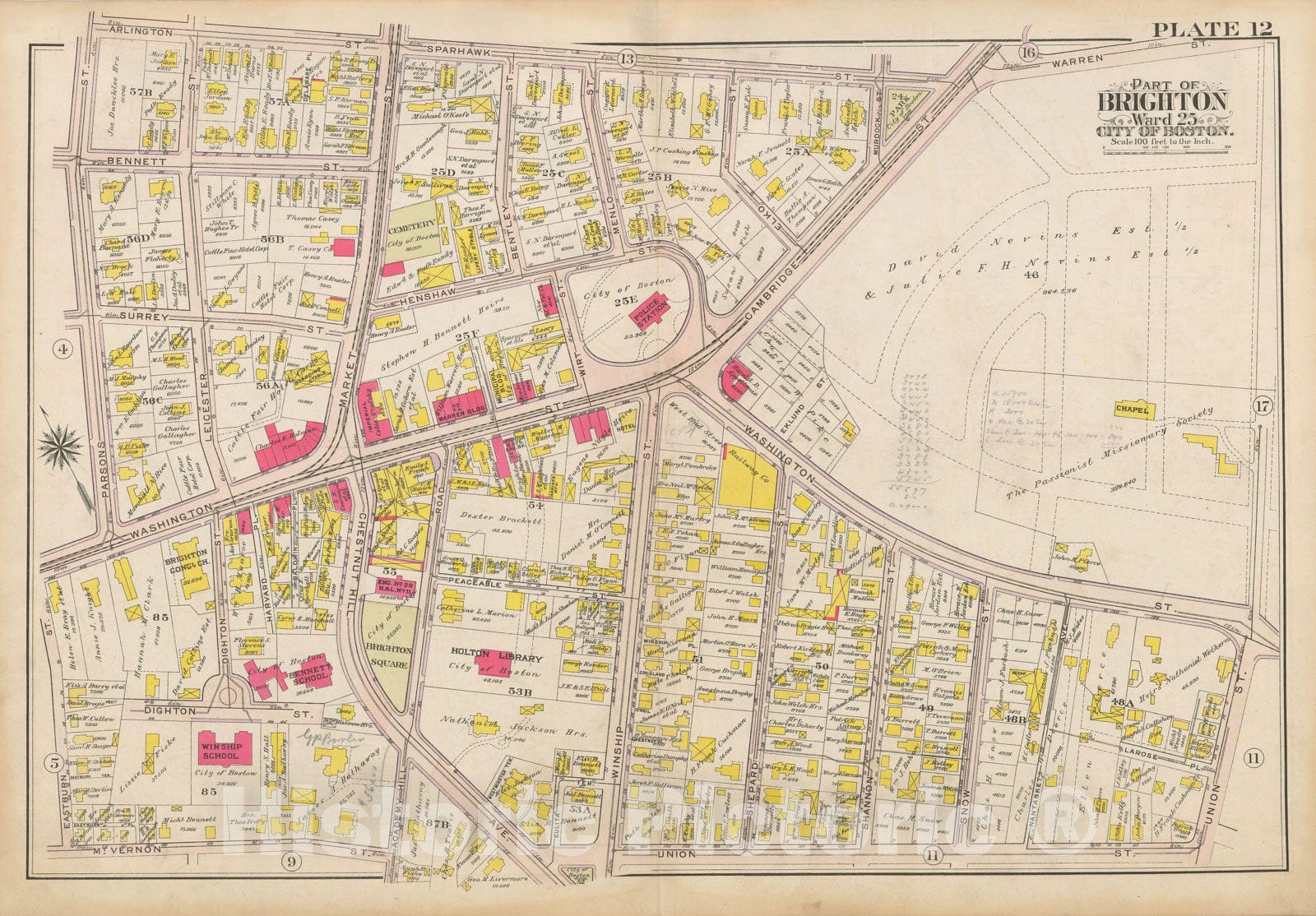 Historic Map : Atlas City of Boston Ward 25 Brighton, Brighton 1909 Plate 012 , Vintage Wall Art