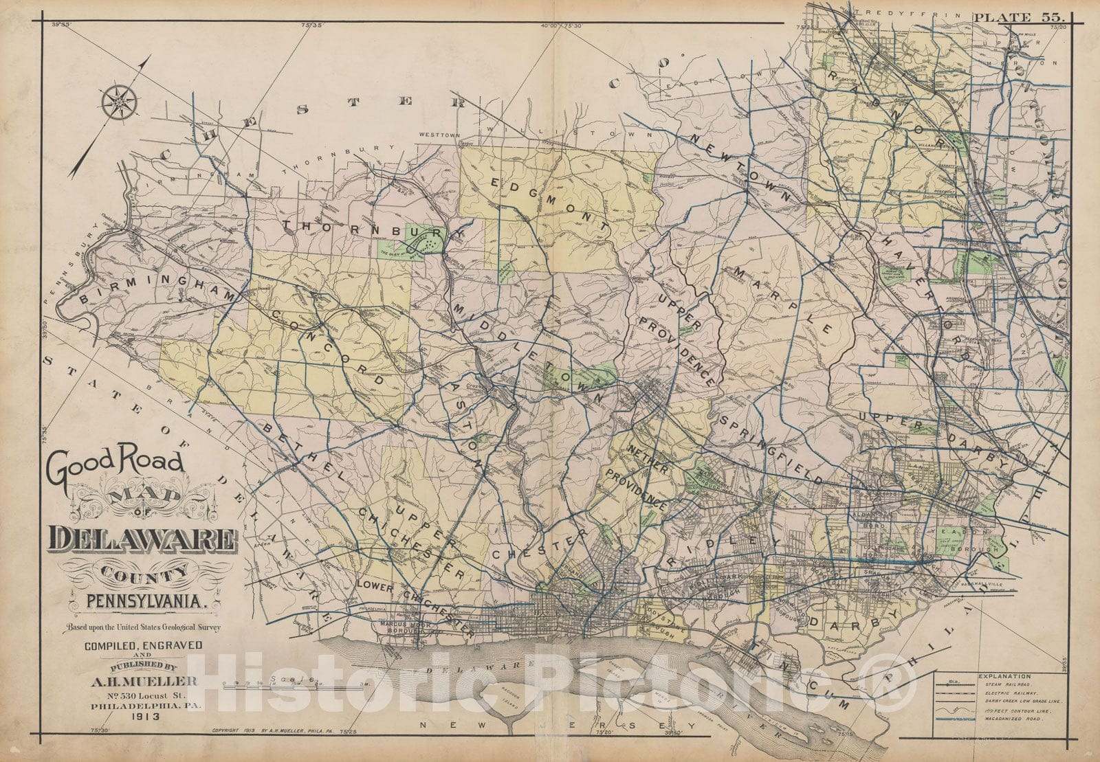 Historic Map : Atlas of Delaware County, West of Ridley Creek, Vol. Two, Delaware 1913 Plate 055 , Vintage Wall Art
