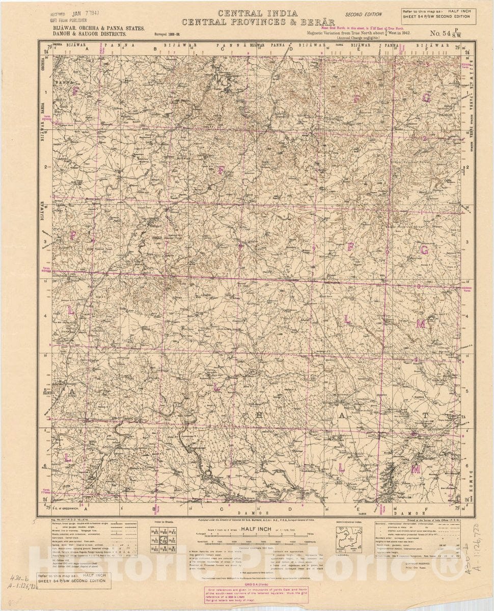 Map : Bijawar, Orchha & Panna States, Damoh & Saugor Districts, Central India,m, 1945, India and adjacent countries, Antique Vintage Reproduction
