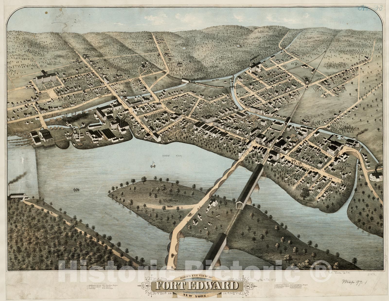 Historical Map, Bird's Eye View of Fort Edward, New York : 1875, Vintage Wall Art