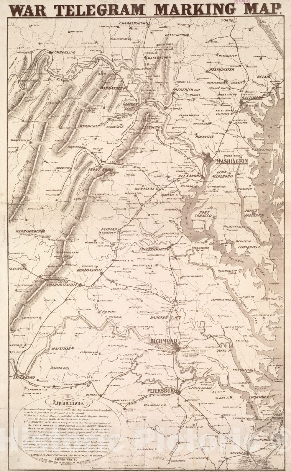 • Historical Map, ca. 1862 War telegram marking Historical Map, Vintage Wall Art