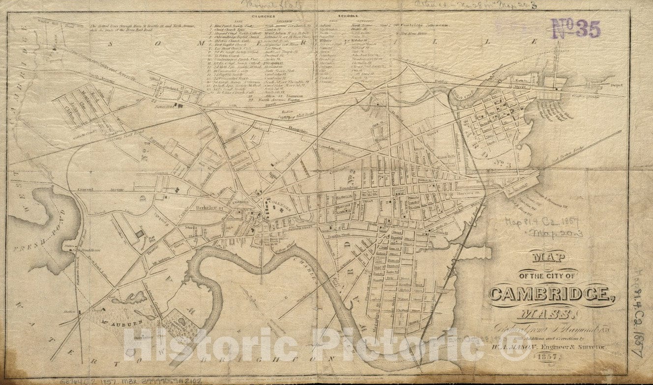 • .Historical Map, Map of the city of Cambridge, Mass : reduced from J. Hayward's 1838 : with additions and corrections, Vintage Wall Art