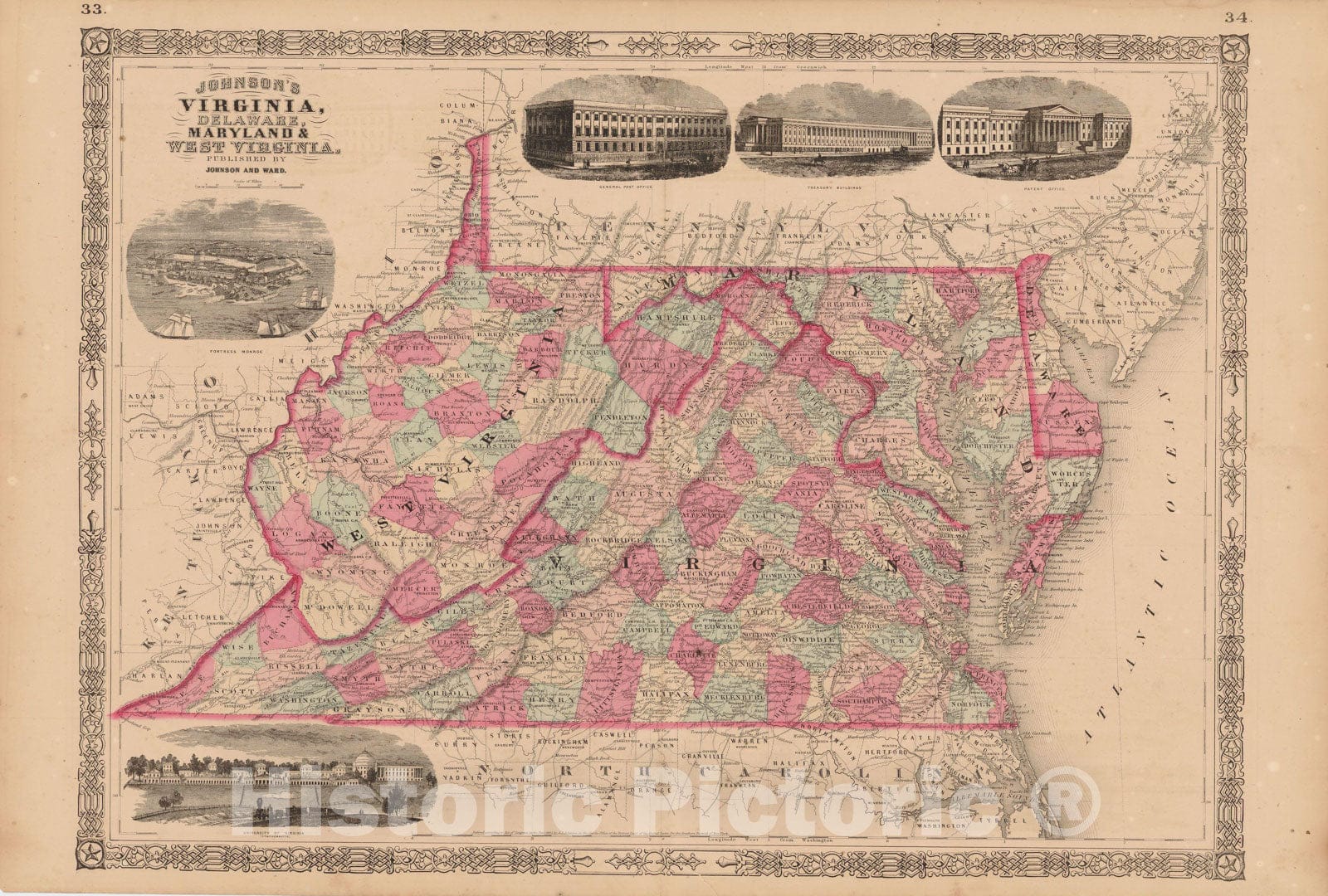 Historic Map : Delaware & Maryland & Virginia & West Virginia 1865 , Johnson's Family Atlas , Vintage Wall Art