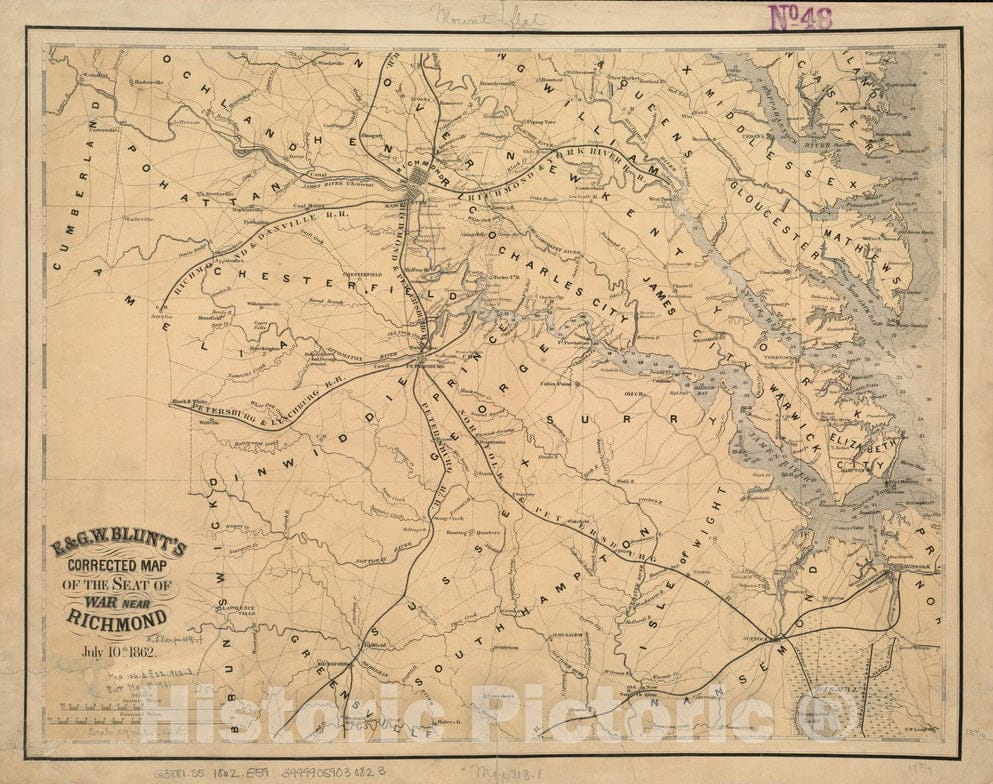 Historical Map, E. & G.W. Blunt's Corrected map of The seat of war Near Richmond, July 10th, 1862, Vintage Wall Art