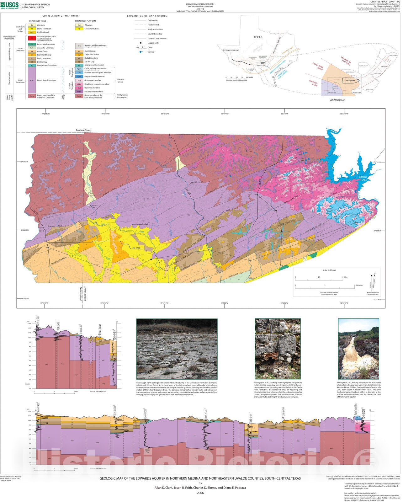 Map : Geologic map of the Edwards aquifer in northern Medina and northeastern Uvalde Counties, south-central Texas, 2006 Cartography Wall Art :