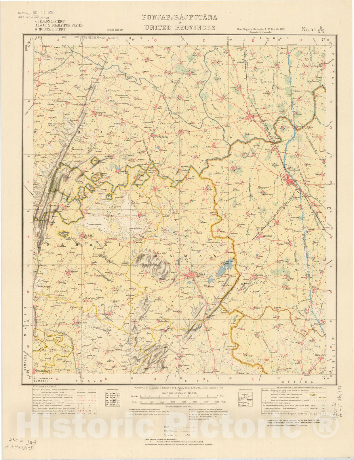 Map : Gurgaon District, Alwar & Bharatpur States, & Muttra District, Punjab, Rajputana & United Provinces, No. 54 E/N.W. 1922, India and adjacent countries