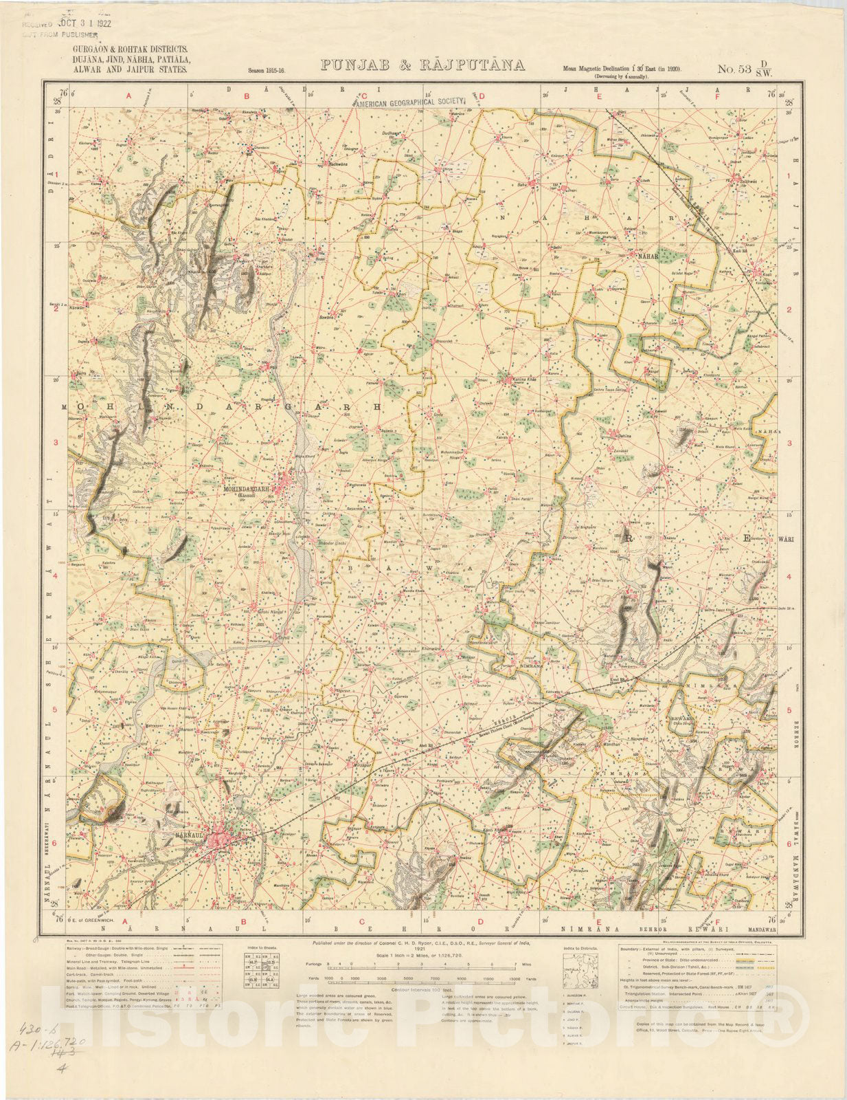 Map : Gurgaon & Rohtak Districts, Dujana, Jind, Nabha, Patiala, Alwar and Jaipur States, Punjab & Rajputana No. 53 D/S.W. 1921, India and adjacent countries