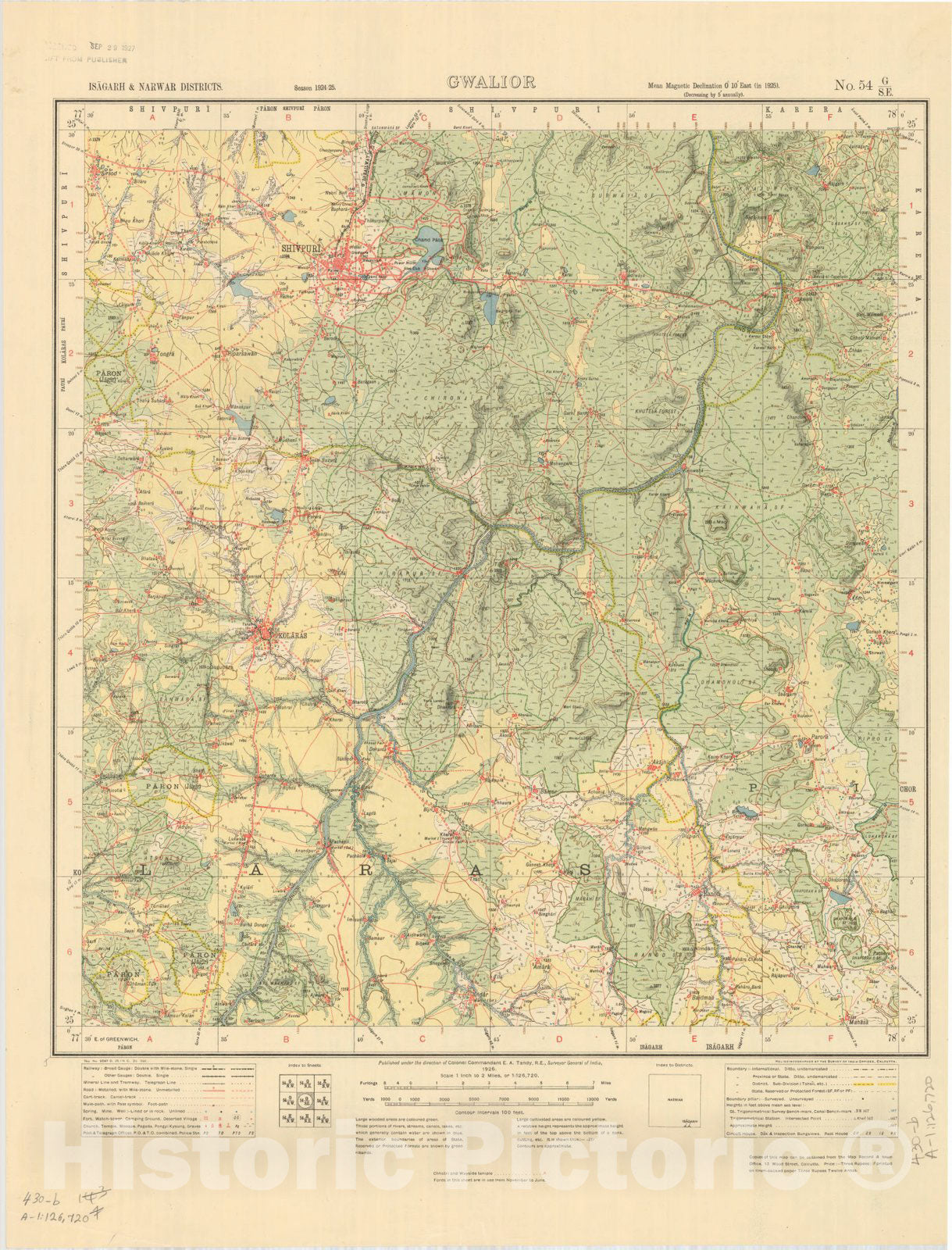Map : Isagarh & Narwar Districts, Gwalior, No. 54 G/S.E. 1925, India and adjacent countries, Antique Vintage Reproduction