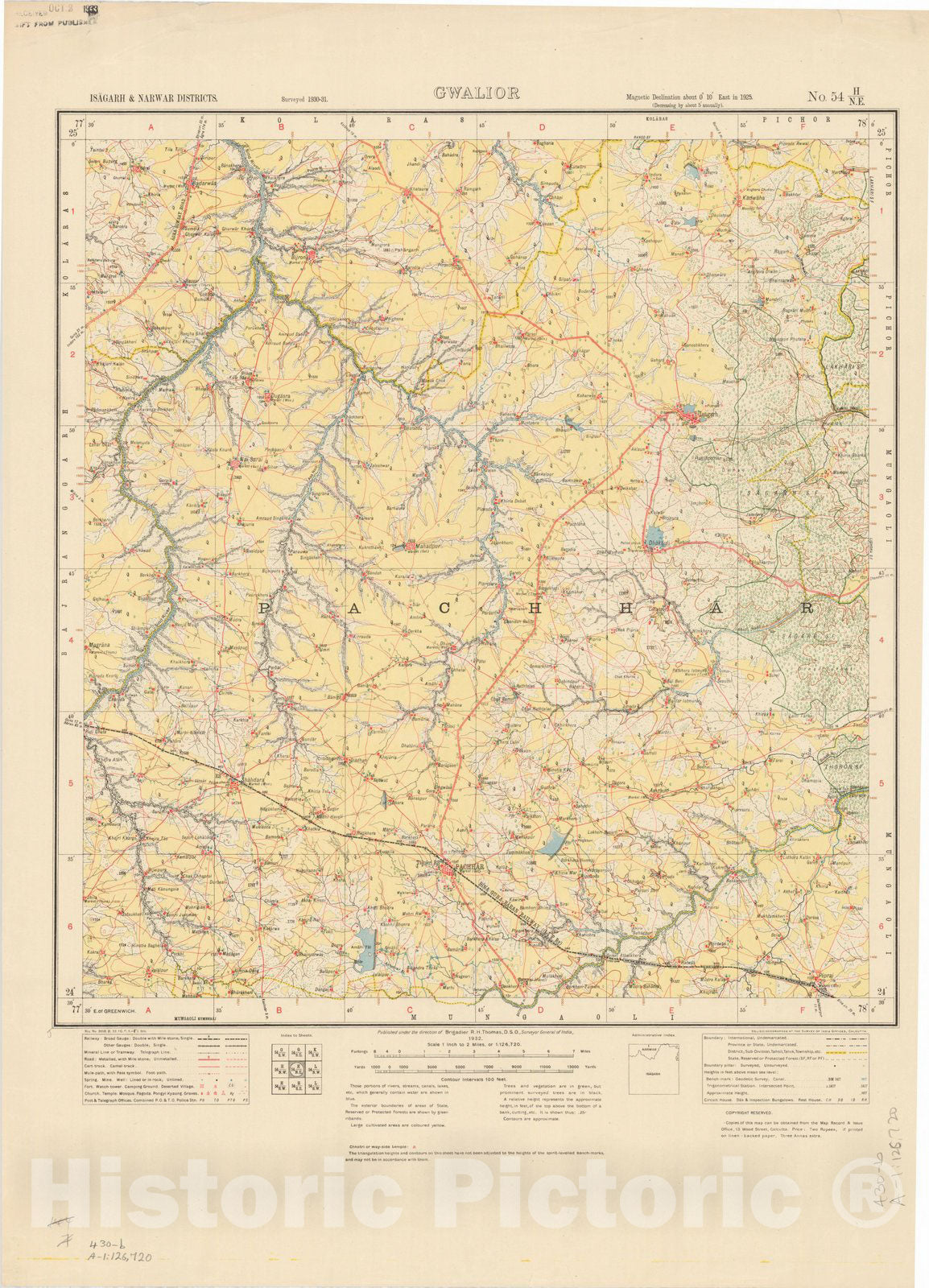 Map : Isagarh & Narwar Districts, Gwalior, No. 54 H/N.E. 1932, India and adjacent countries, Antique Vintage Reproduction