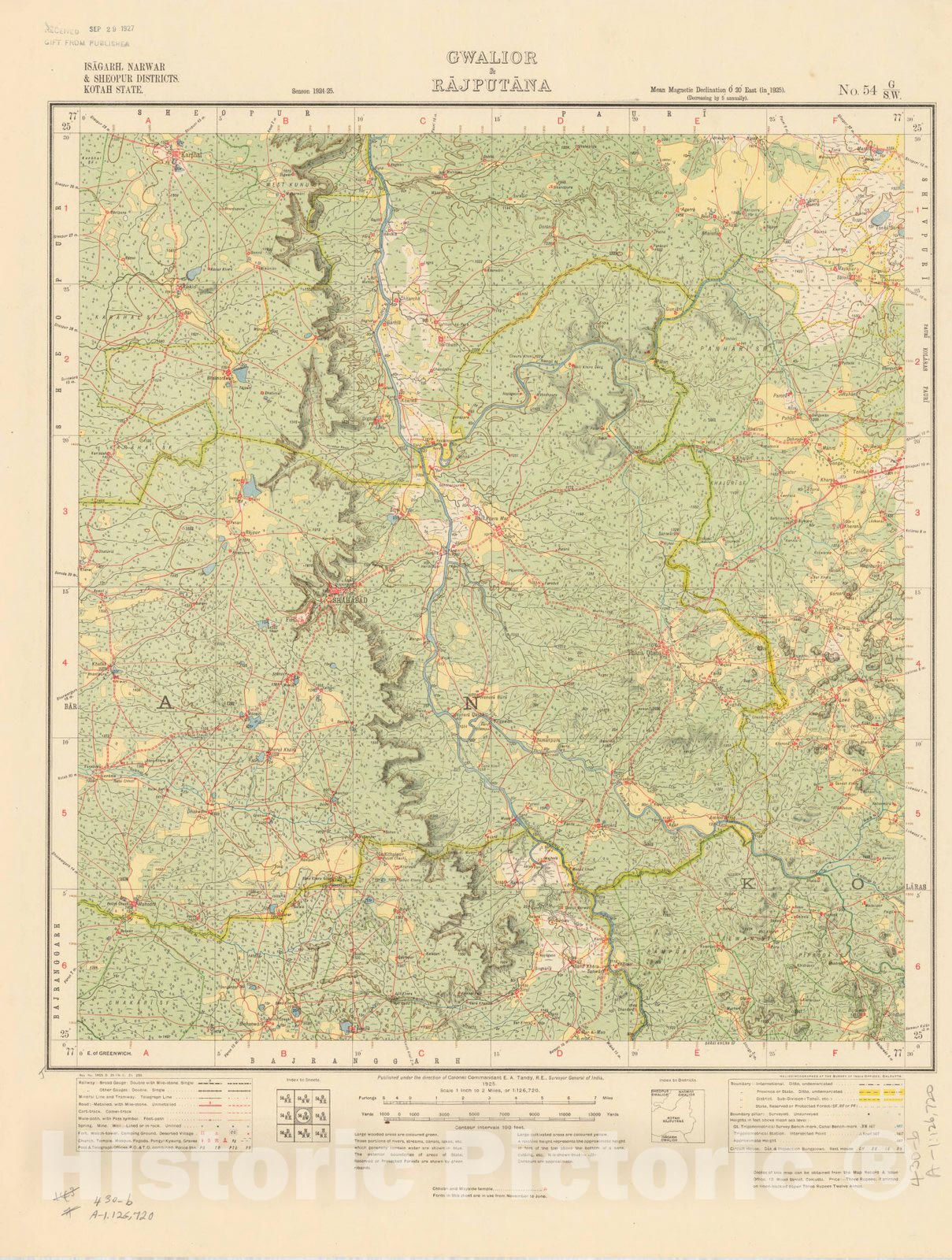 Map : Isagarh, Narwar & Sheopur Districts, Kotah State, Gwalior & Rajputana, No. 54 G/S.W. 1925, India and adjacent countries, Antique Vintage Reproduction