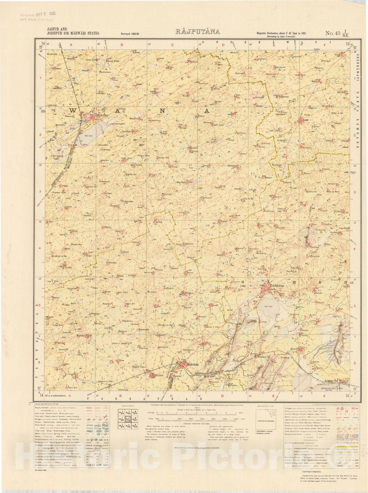 Map : Jaipur and Jodhpur (or Marwar) States, Rajputana, No. 45 I/S.E. 1933, India and adjacent countries, Antique Vintage Reproduction
