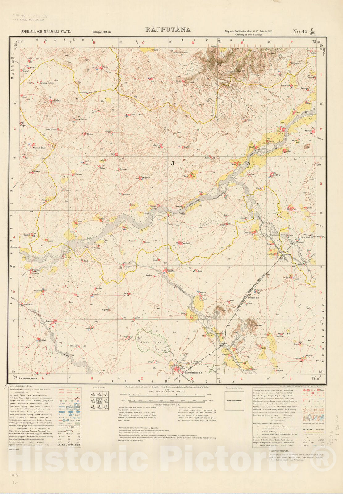 Map : Jodhpur (or Marwar) State, Rajputana, No. 45 C/S.W. 1936, India and adjacent countries, Antique Vintage Reproduction