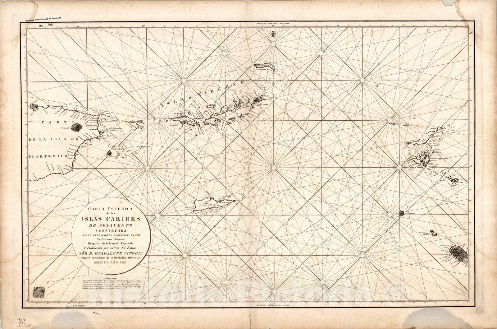 Carta esferica de las Islas Caribes de Sotavento construido sobre operaciones geodesicas en 1795 / Por Dn. Cosme Churruca, Brigadier de la Armada Espanola y publicado por orden del Exmo. Sor D. Guadalupe Vitoria Primer Presidente de la Republica Mexica