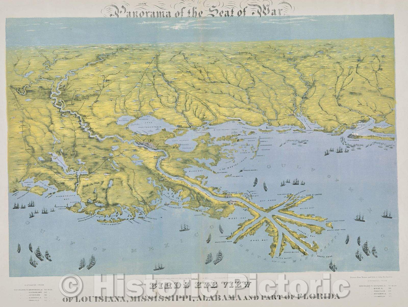 Historic Map : Panorama of the seat of war: birds eye view of Louisiana, Mississippi, Alabama and part of Florida., 1861 , Vintage Wall Art