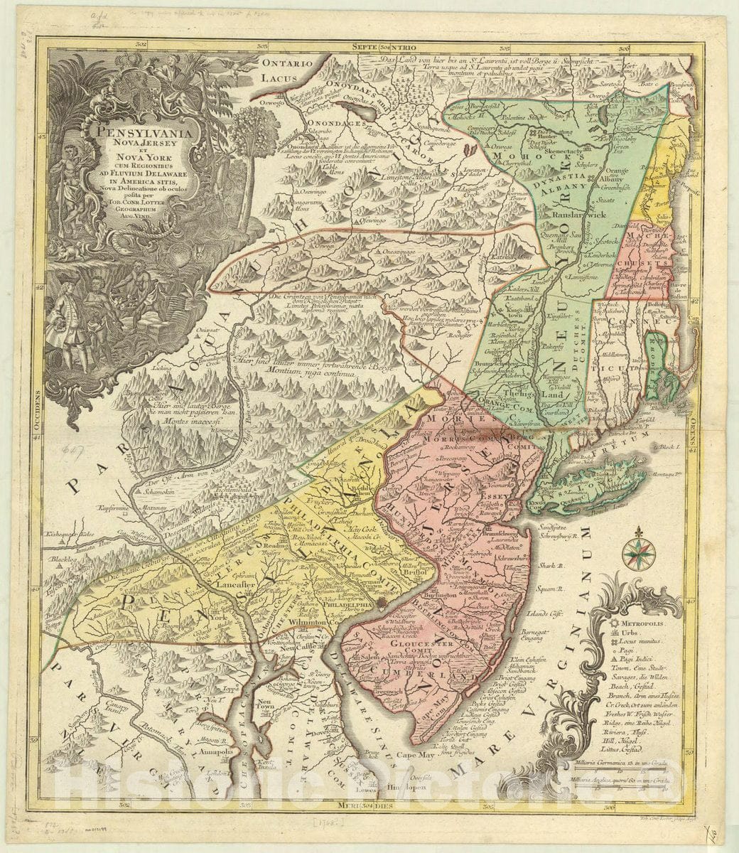 Pensylvania, Nova Jersey et Nova York cum regionibus ad Fluvium Delaware in America sitis / nova delineatione ob oculos posita per Tob. Conr. Lotter, geographum Aug. Vind. ; Tob. Conr. Lotter sculps. Aug. V