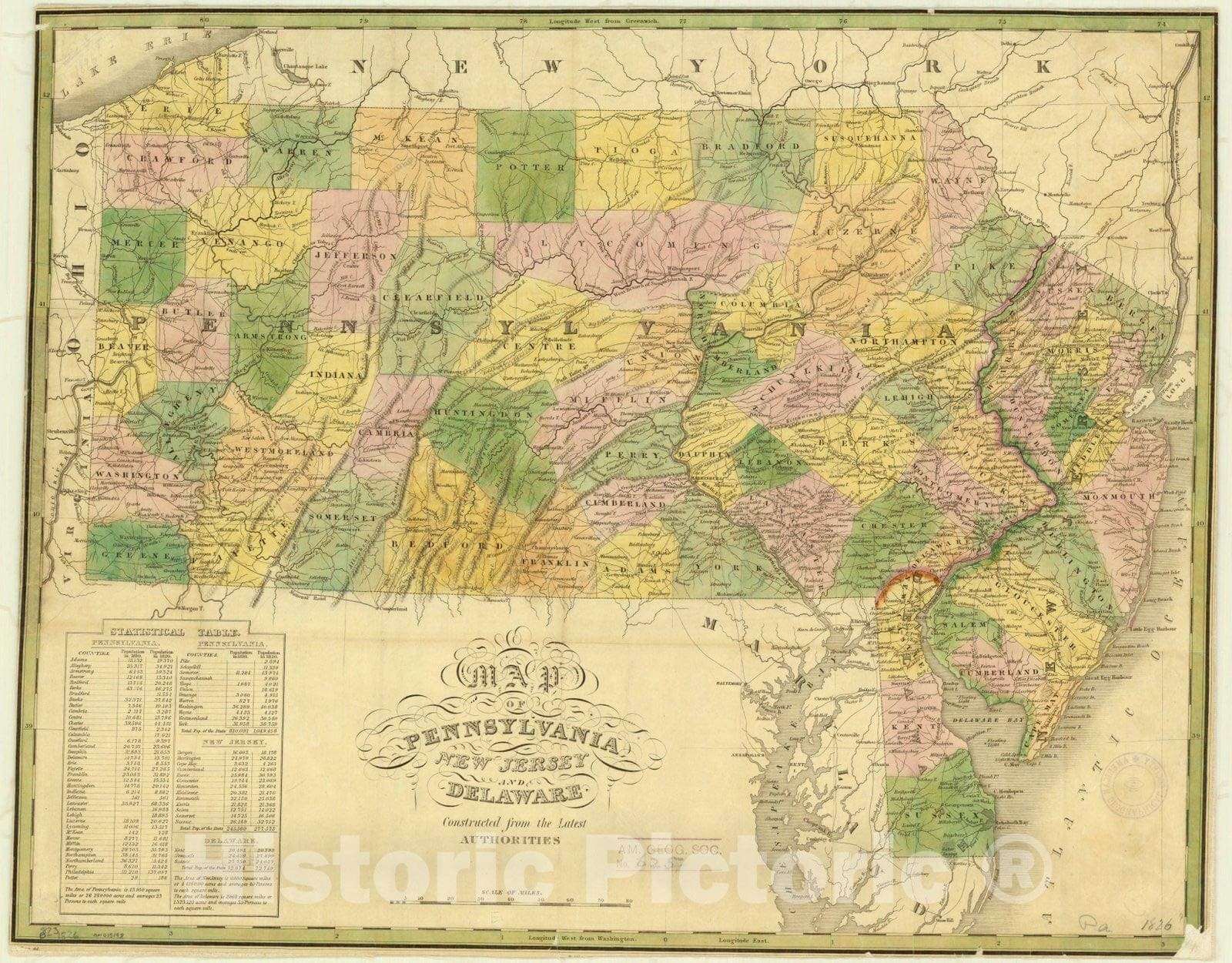 Map : Pennsylvania 1826, Map of Pennsylvania, New Jersey and Delaware : constructed from the latest authorities , Antique Vintage Reproduction