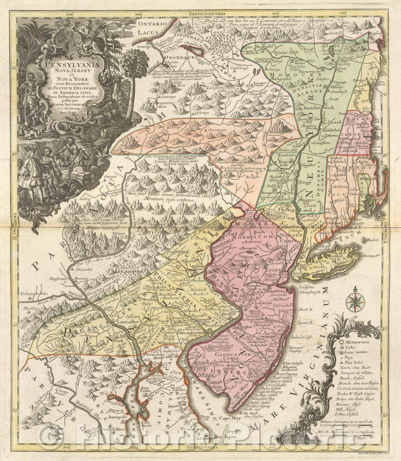 Historic Map : Pensylvania Nova Jersey et Nova York cum regionibus ad fluvium Delaware in America sitis, 1700 , Vintage Wall Art