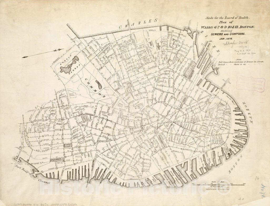 Historical Map, Plan of wards 6, 7, 8, 9, 10 and 12, Boston : showing sewers and contours : Jan, 1878, Vintage Wall Art