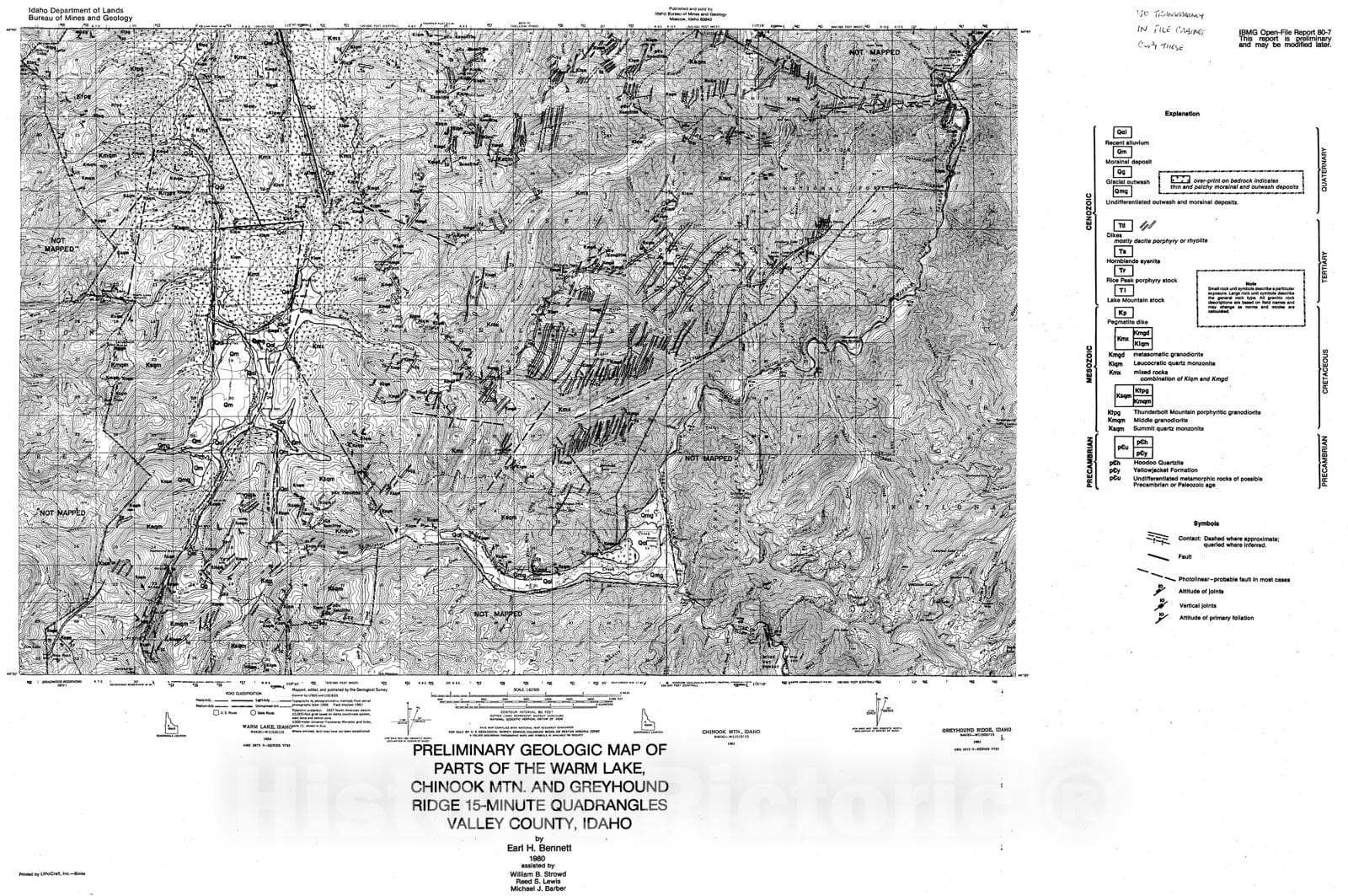 Map : Preliminary geologic map of parts of the Warm Lake, Chinook Mtn. and Greyhound Ridge 15-minute quadrangles, Valley County, Idaho, 1980 Cartography Wall Art :