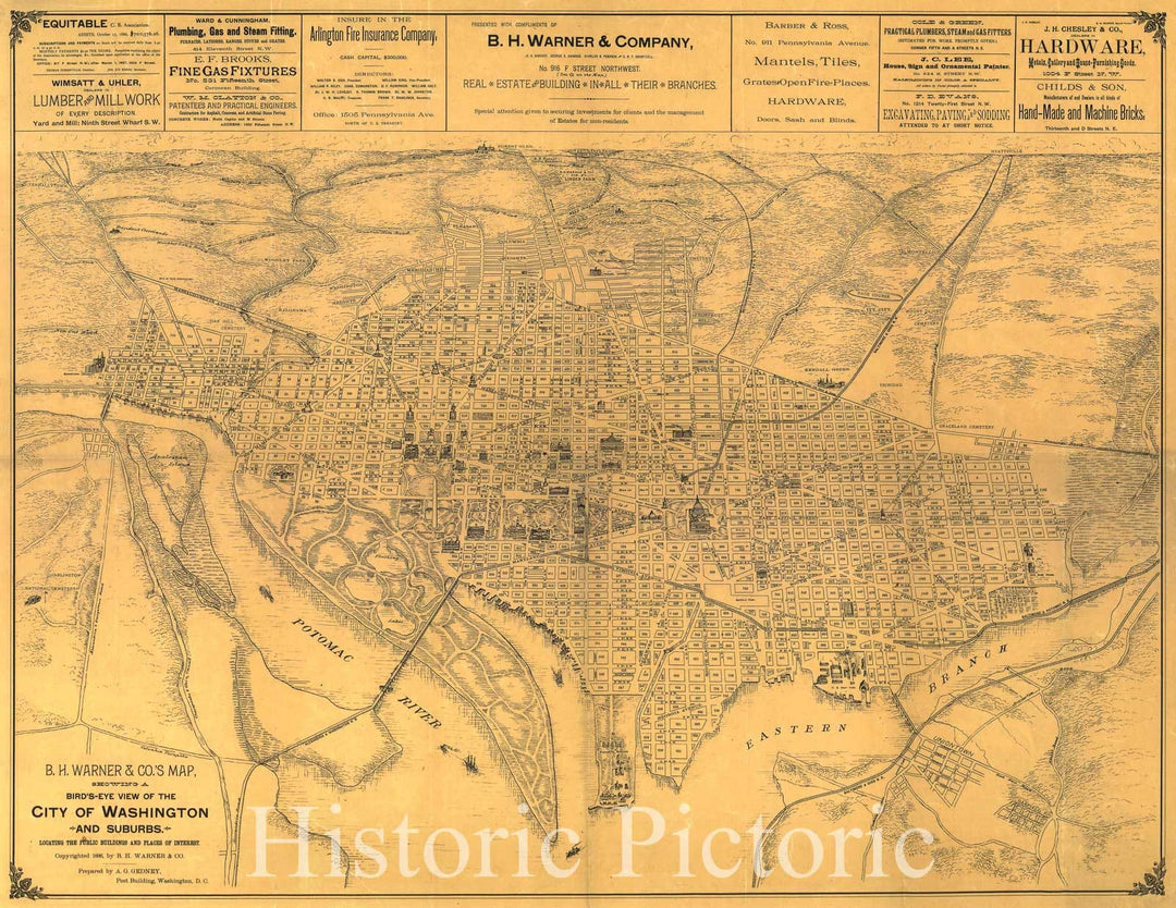 Historic 1886 Map - B.H. Warner & Co.'s Map Showing a Bird's-Eye View of The City of Washington and Suburbs : locating The Public Buildings and Places of Interest