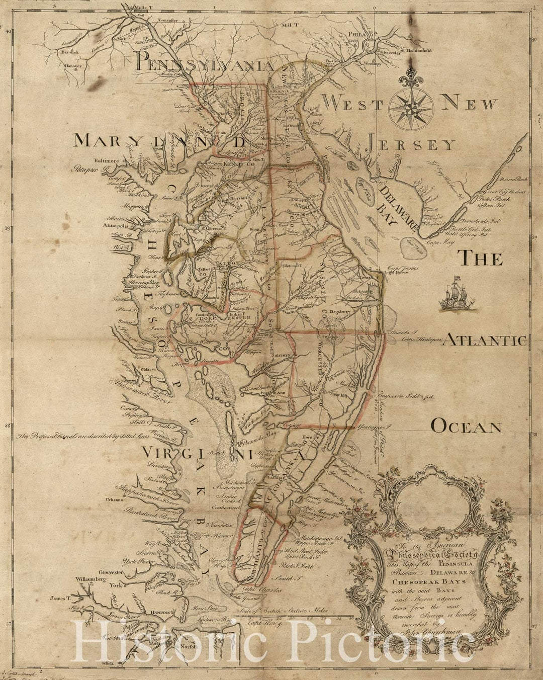 Historic 1786 Map - to The American Philosophical Society, This map of The Peninsula Between Delaware & Chesopeak Bays, with The Said Bays and Shores Adjacent
