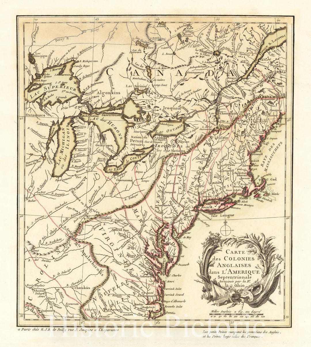 Historic Map : First French Map of the French and Indian War, c1754, N. J. B. de Poilly, Vintage Wall Art