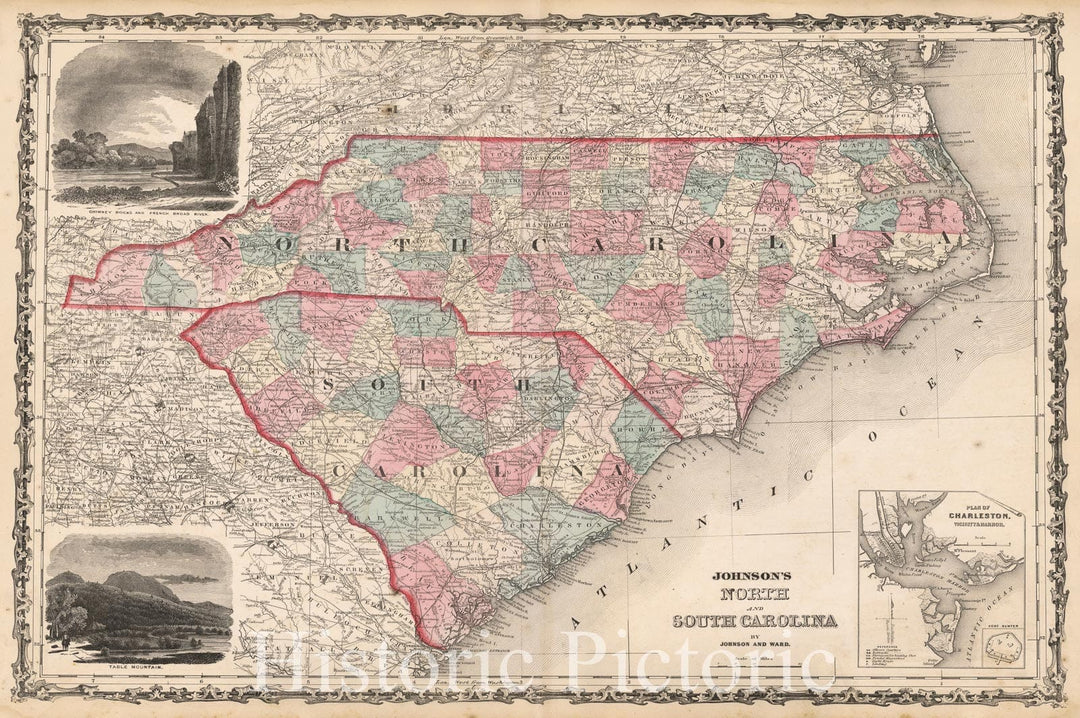 Historic Map : Johnson's North and South Carolina (with large inset of Charleston Harbor), 1863, Benjamin P Ward, Vintage Wall Art