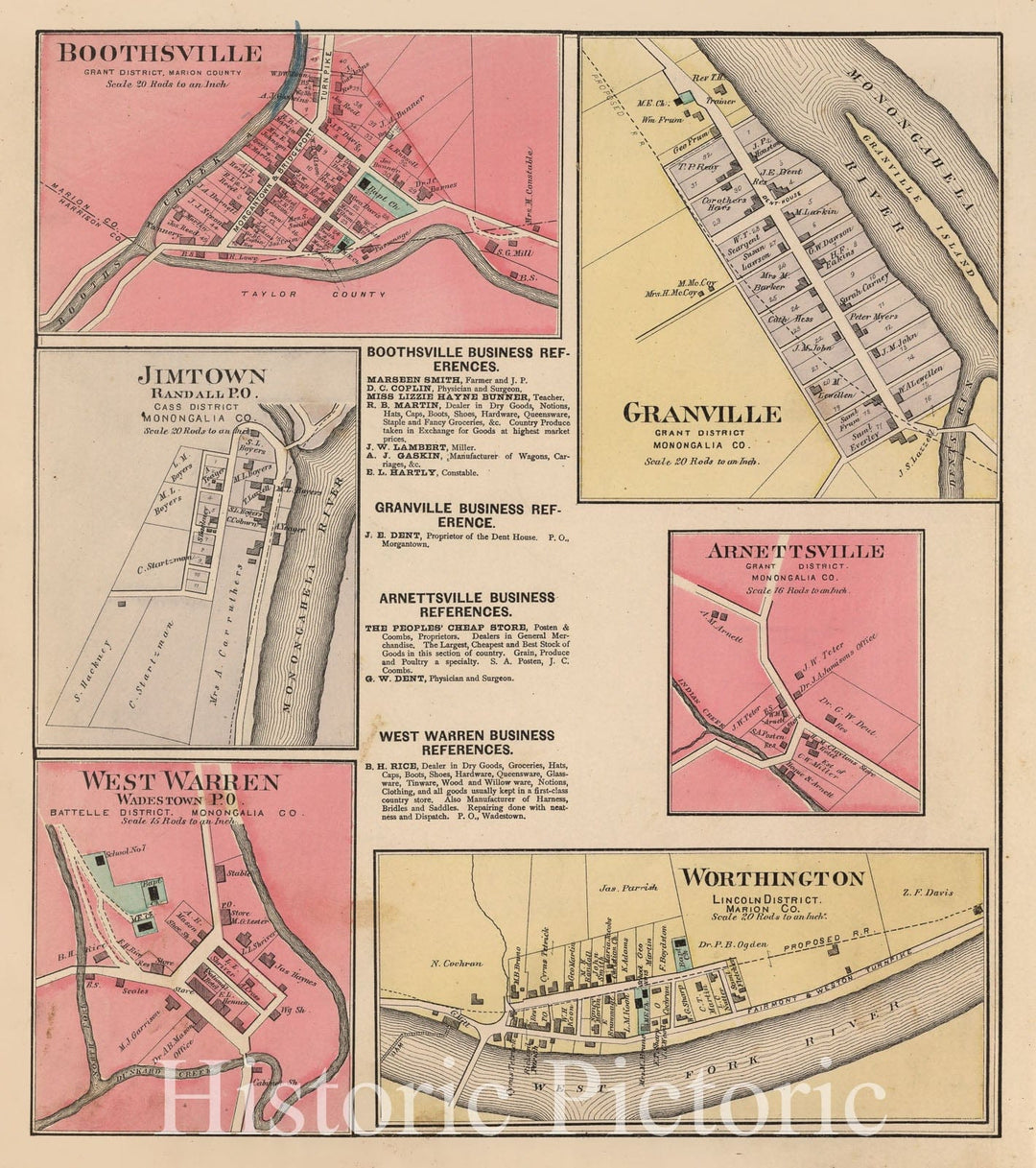 Historic Map : 1886 Boothsville, Jimtown, West Warren, Granville, Arnettsville, and Worthington, West Virginia. - Vintage Wall Art