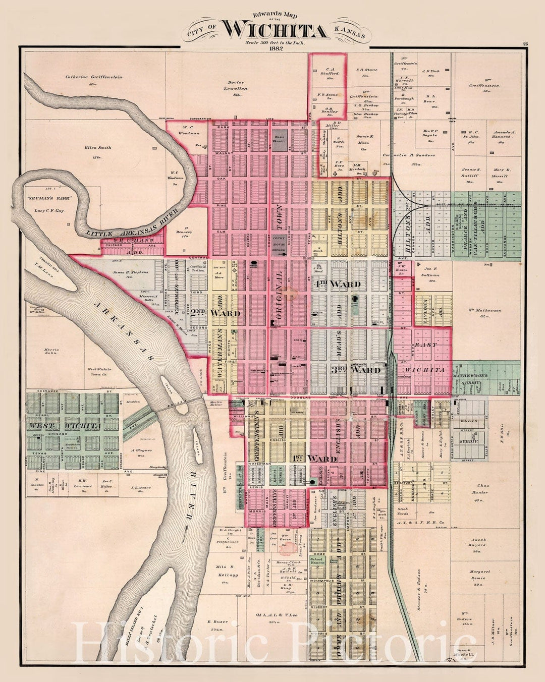 Historic Map : Edwards Map of the City of Wichita, Kansas. 1882., 1882, Vintage Wall Art