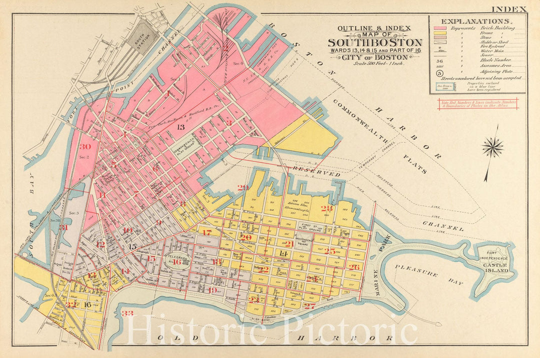 Historical Map, Outline & Index map of South Boston, wards 13, 14, 15, and Part of 16, City of Boston, Vintage Wall Art