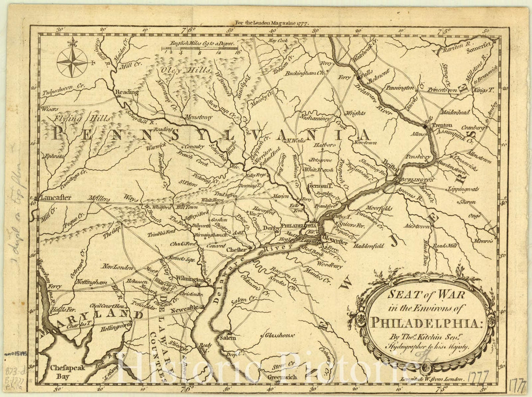 Map : Philadelphia, Pennsylvania 1777, Seat of war in the environs of Philadelphia: By Thos. Kitchin, Senr, Antique Vintage Reproduction