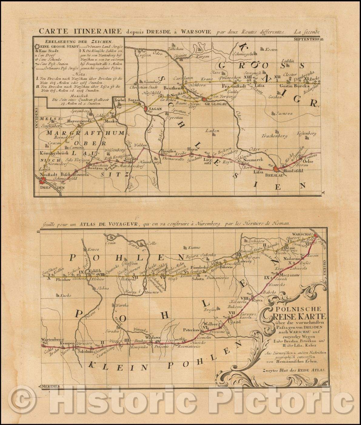 • .Historic Map - Polnische Reise Karte uber die vornehmsten Passagen von Dresden/Road Map showing two roads from Dresden via Glogau or Breslau to Warsaw, 1751 - Vintage Wall Art