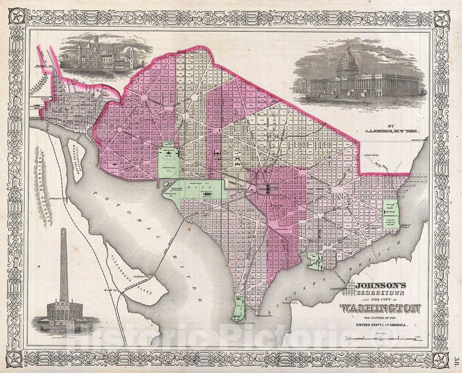 A beautiful example of A. J. Johnson's 1864 map of Washington D.C. and Georgetown. Offers a fascinating snapshot of the nation's capitol shortly after the outbreak of the American Civil War. Shows the city in considerable detail with color coding according to ward. Notes numerous important buildings including the Capitol, the Smithsonian Institution, the White House (not yet called the White House), the Washington Monument, the National Observatory, the Naval Yard, the Poor House, the City Hall, and others. Shows the grid and ray structure according to L'Enfant's brilliant plan. Georgetown appears as a separate entity in the upper left corner with Georgetown College noted just outside the city border. Also shows proposed landfills and extensions to the east side of the city into the east branch of the Potomac River. The grand dome of the Capitol Building, shown complete in the upper right hand quadrant of this map, was only partially complete when this map was issued. The Washington Monument appears in an earlier unrealized conceptualization in the lower left quadrant. The Smithsonian Institution, now the nation's largest museum, is pictured in the upper left quadrant. Features the fretwork style border common to Johnson's atlas work from 1864 to 1869. Published by A. J. Johnson and Ward as plate number 37 in the 1864 edition of Johnson's New Illustrated Family Atlas . This is the first edition of Johnson's Atlas to bear the "Johnson and Ward" imprint.