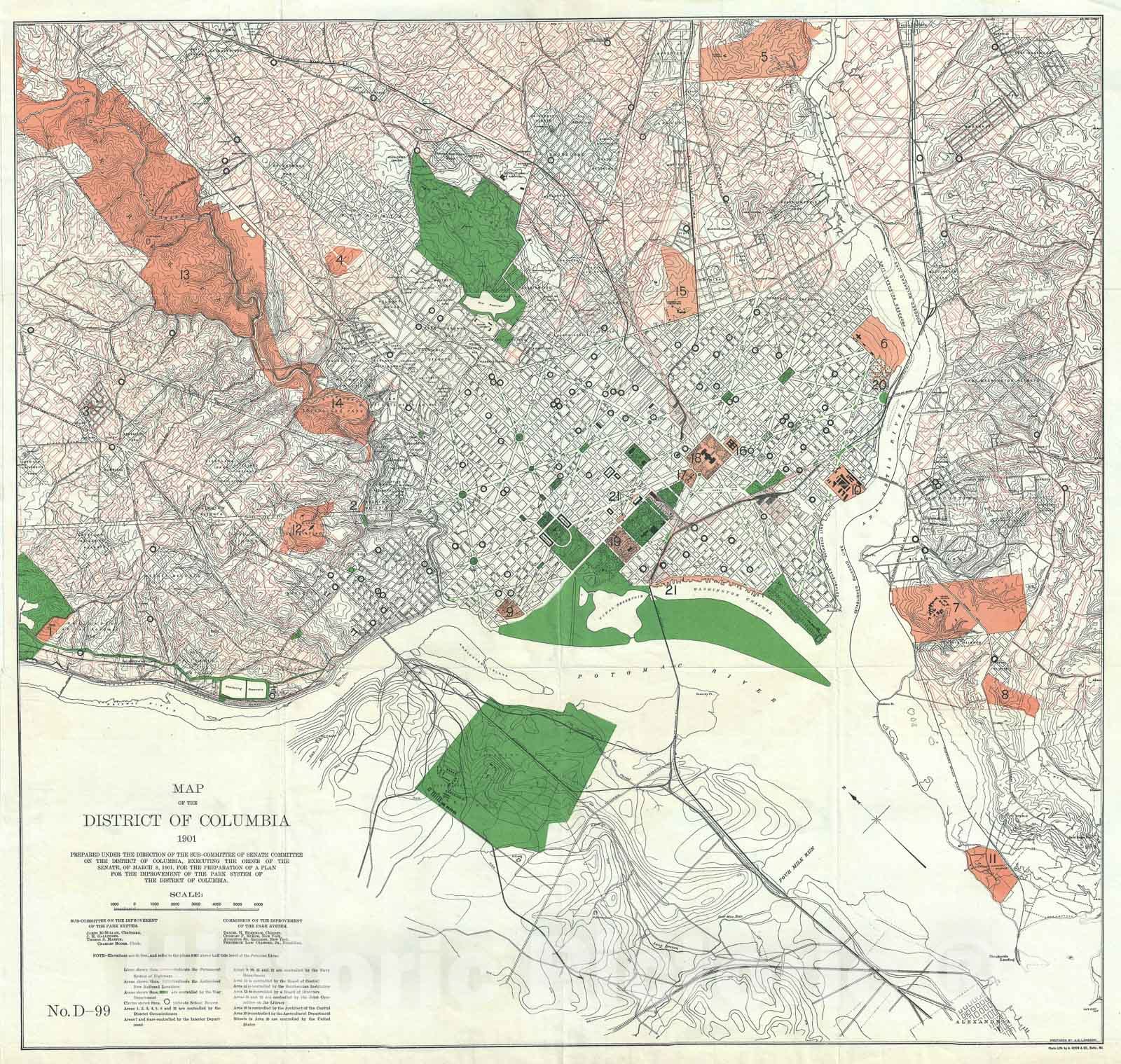 Plan of Washington D.C. showing Park System, Parks Commission, 1901