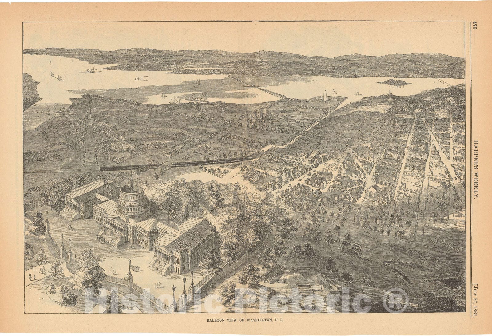 Historic Map : Washington D.C. (Dist. of Columbia), Washington 1861 Bird's Eye View , Vintage Wall Art