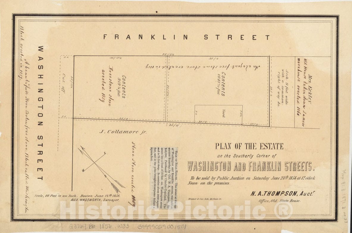 Historical Map, 1856 Plan of The Estate on The southerly Corner of Washington and Franklin Streets : to be Sold by Public Auction on Saturday June 28th 1856 at 1, Vintage Wall Art