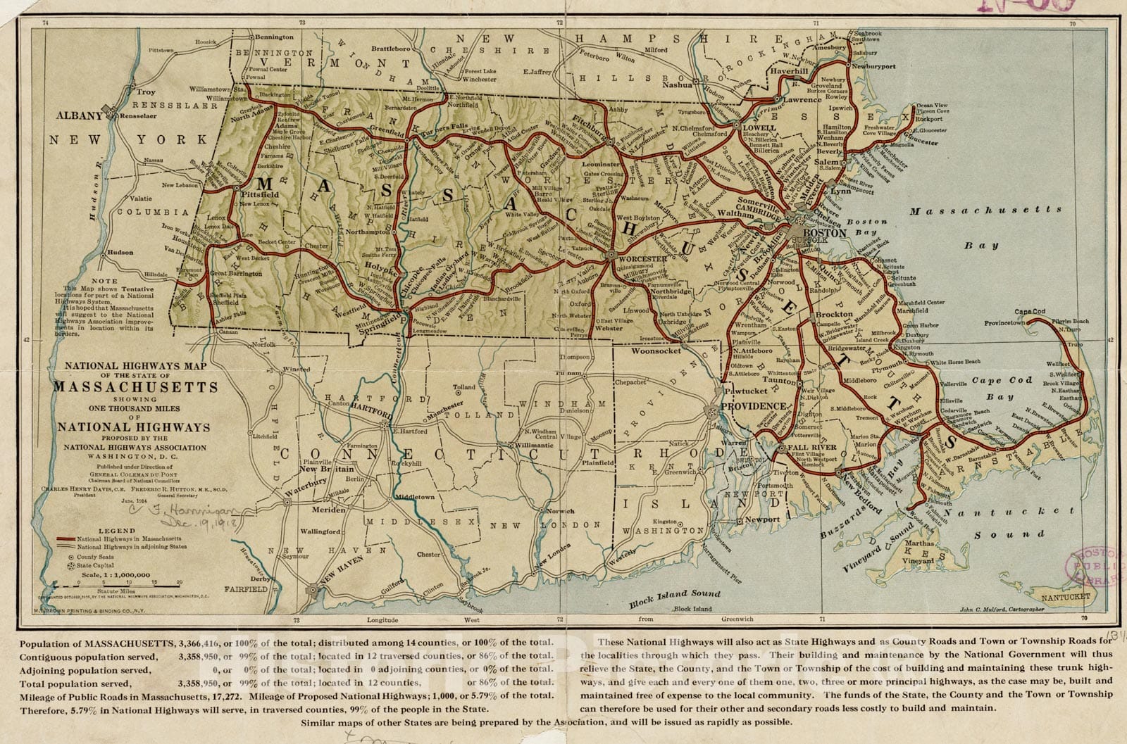 National Highways map of the state of Massachusetts showing one thousand miles of national highways proposed by the National Highways Association, Washington D.C