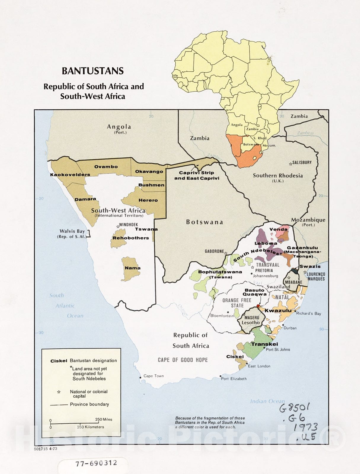 Historic 1973 Map - Bantustans, Republic of South Africa and South-West Africa.