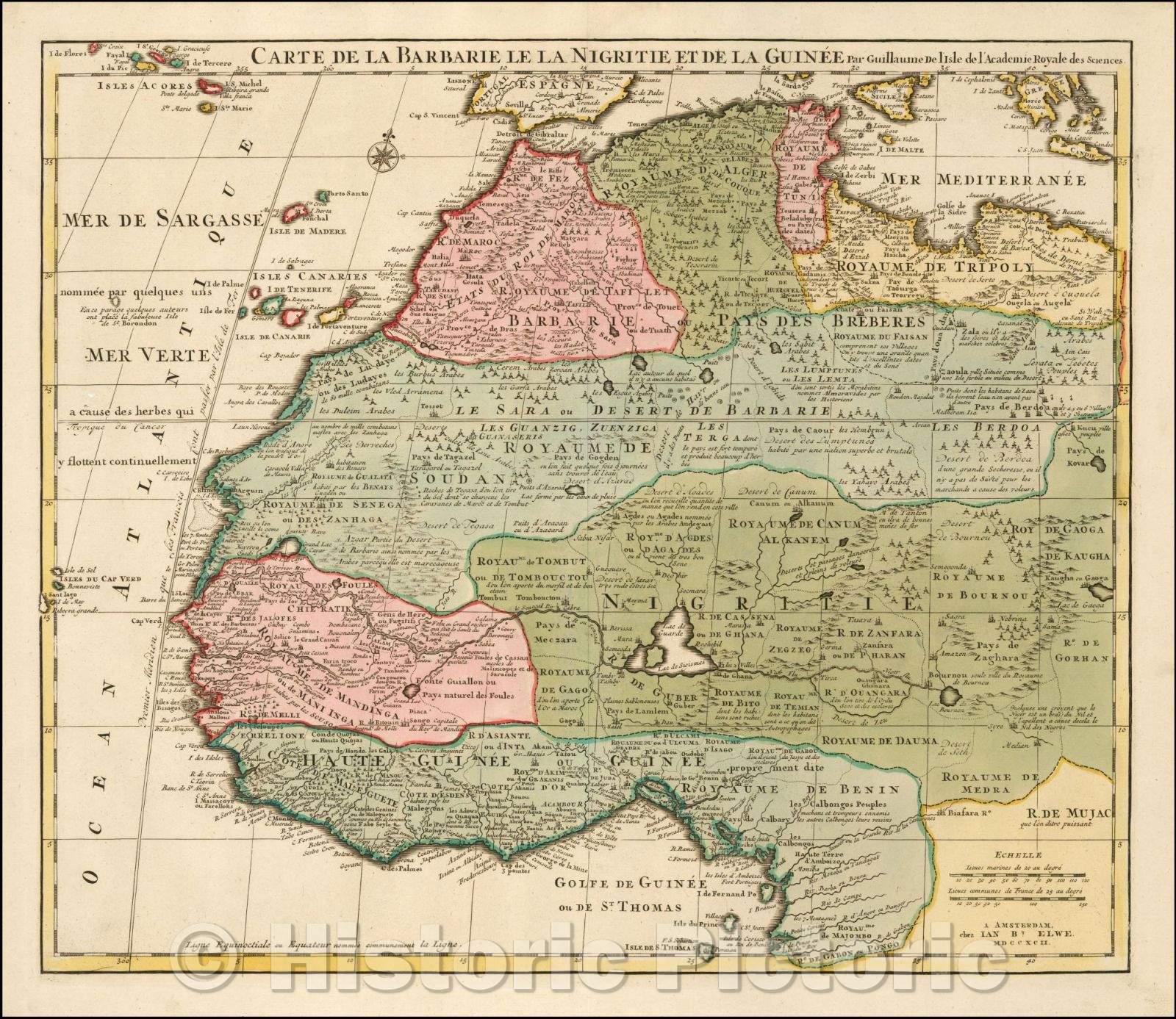 Historic Map - Carte De La Barbarie Le La Nigritie Et De La Guinee :: Northwestern Africa,colored by Regions, De L'Isle's first published circa 1700, 1792 - Vintage Wall Art