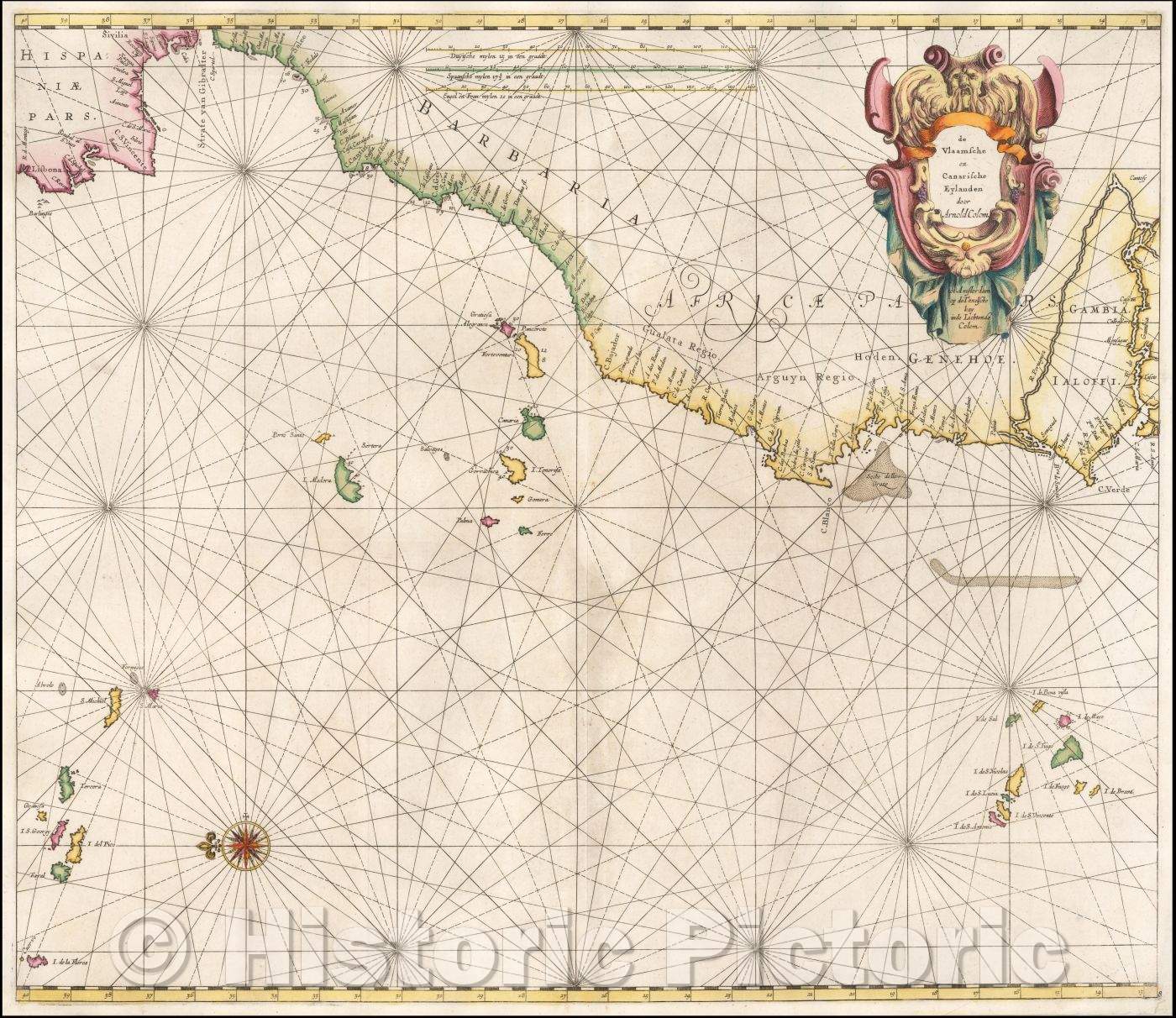 Historic Map - de Vlaamsche en Canarische Eylanden door Arnold Colom. / Sea Chart of west Africa, the Canary Islands, and Iberian Peninsula, 1658, Arnold Colom - Vintage Wall Art