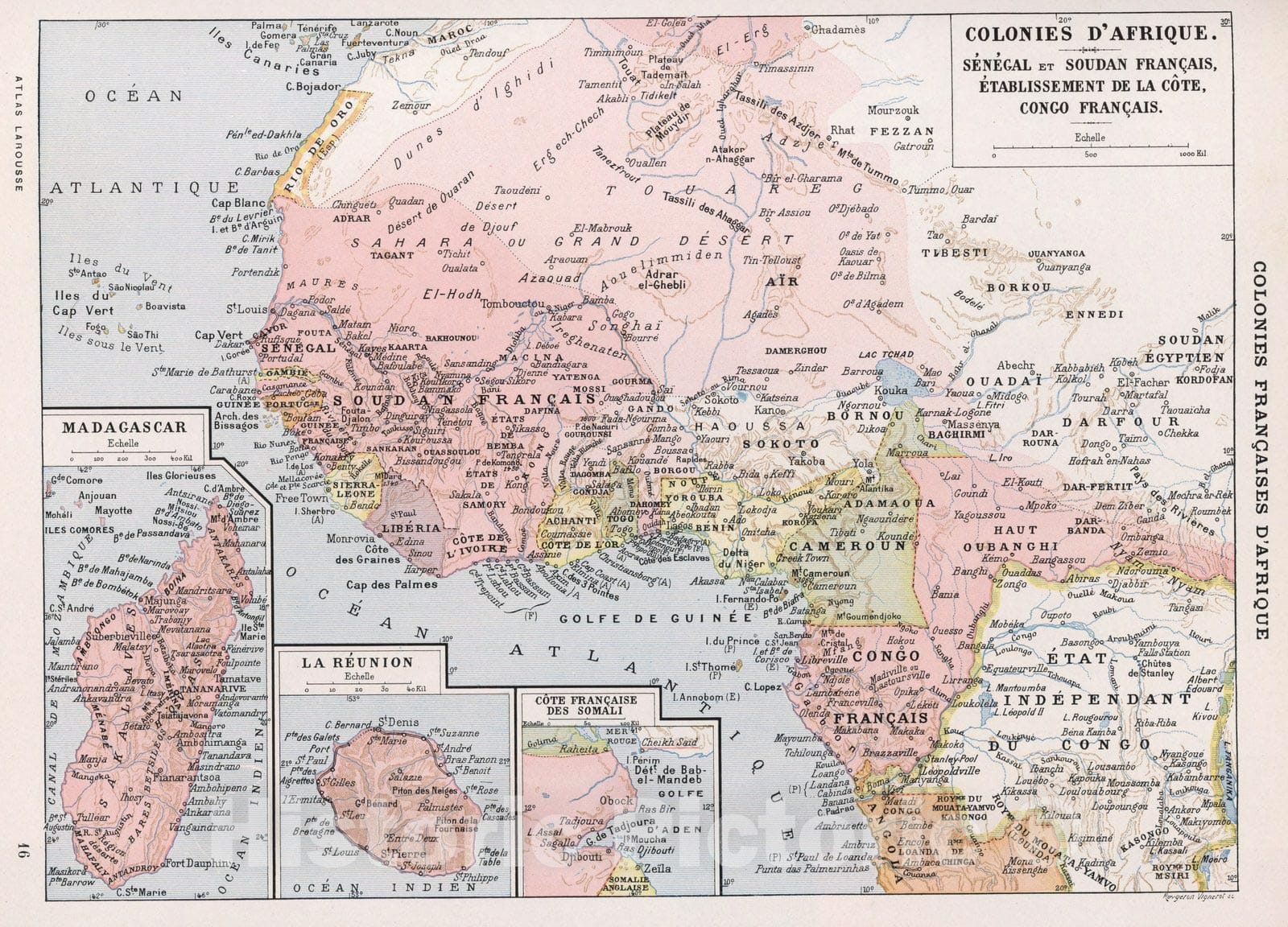 Colonies Francaises d'Afrique. (insets) Madagascar. La Reunion. Cote Francaise des Somali. | Atlas Larousse Illustre. Librairie Larousse, Paris. (first unillustrated title page) Atlas Larousse Illustre. 42 Cartes. - 1158 Reproductions photographiques. | Maps are printed in full and outline color. In French.