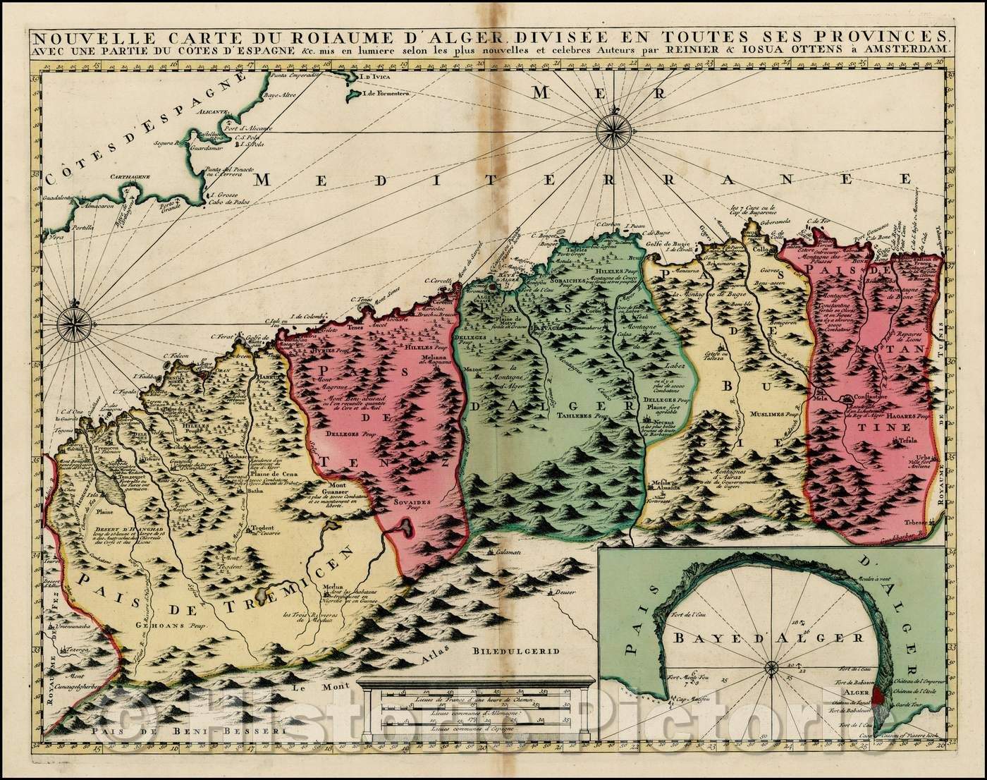 • .Historic Map - Nouvelle Carte Du Roiaume D'Alger Divisee En Toutes Ses Provinces/Map of the Western Mediterranean and part of the Coast of North Africa, 1740 - Vintage Wall Art