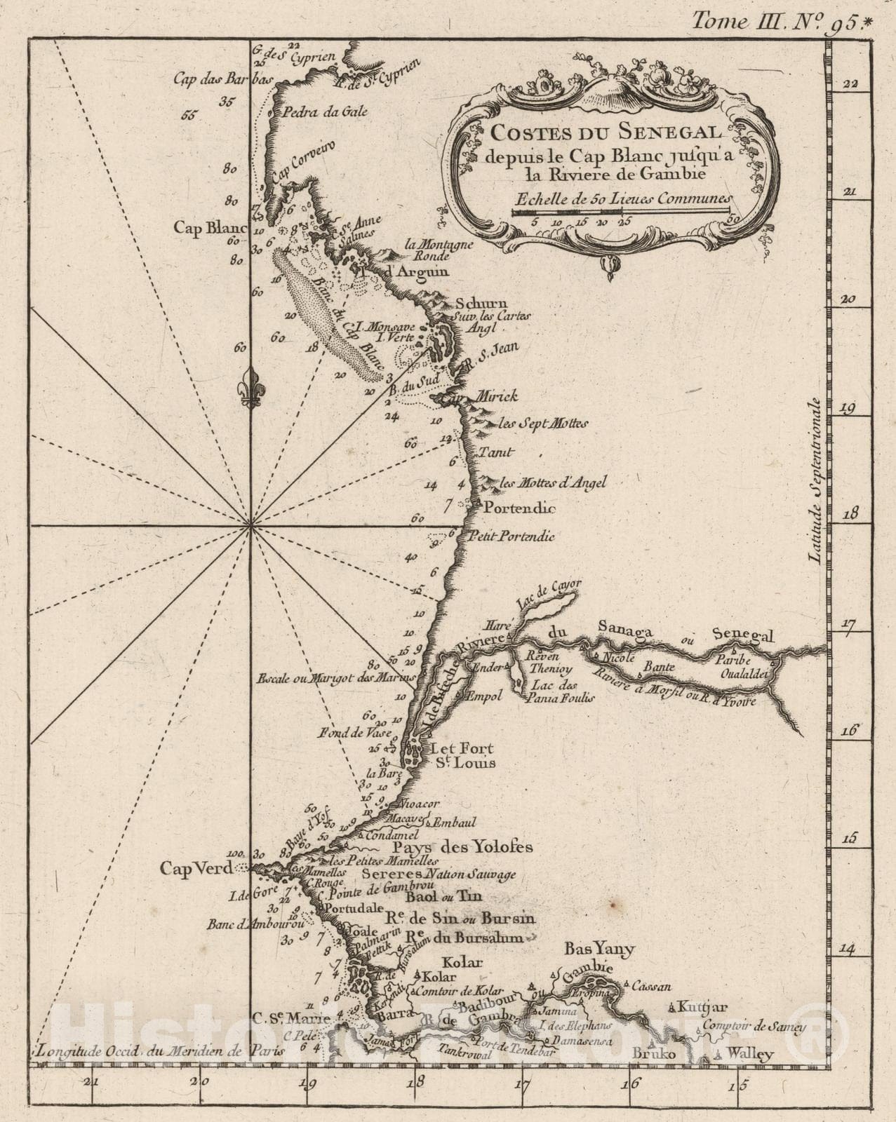 • .Historic Map : Senegal, West Africa 1764 Cours de la Riviere de Sanaga ou Senegal Depuis son Embouch.re Jusqu'a I'Isle de Bilbas , Vintage Wall Art
