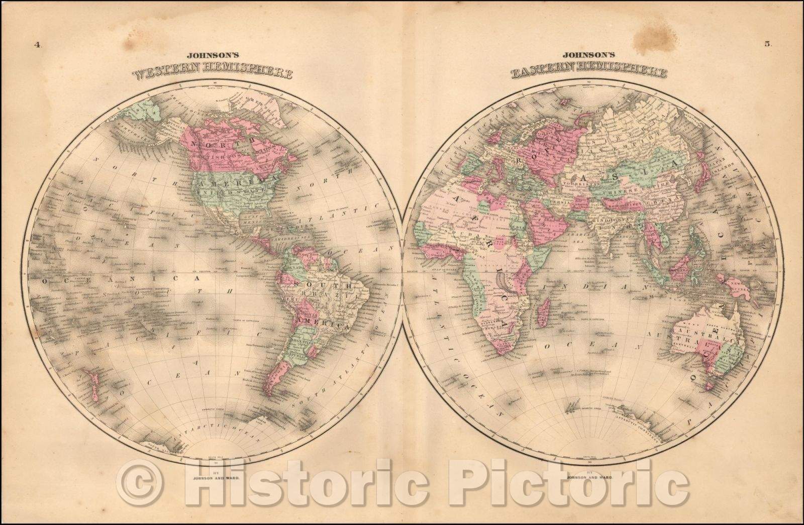 Historic Map - Johnson's Western Hemisphere & Johnson's Eastern Hemisphere, 1865, Benjamin P Ward - Vintage Wall Art