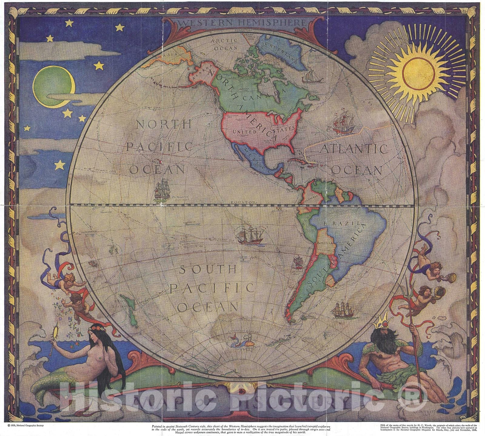 Historic Map : National Geographic Society and Wyeth Print of Western Hemisphere Mural, 1928, Vintage Wall Art