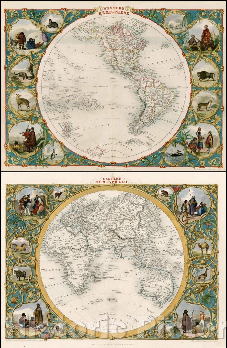 Western Hemisphere and Eastern Hemisphere, 1851, John Tallis