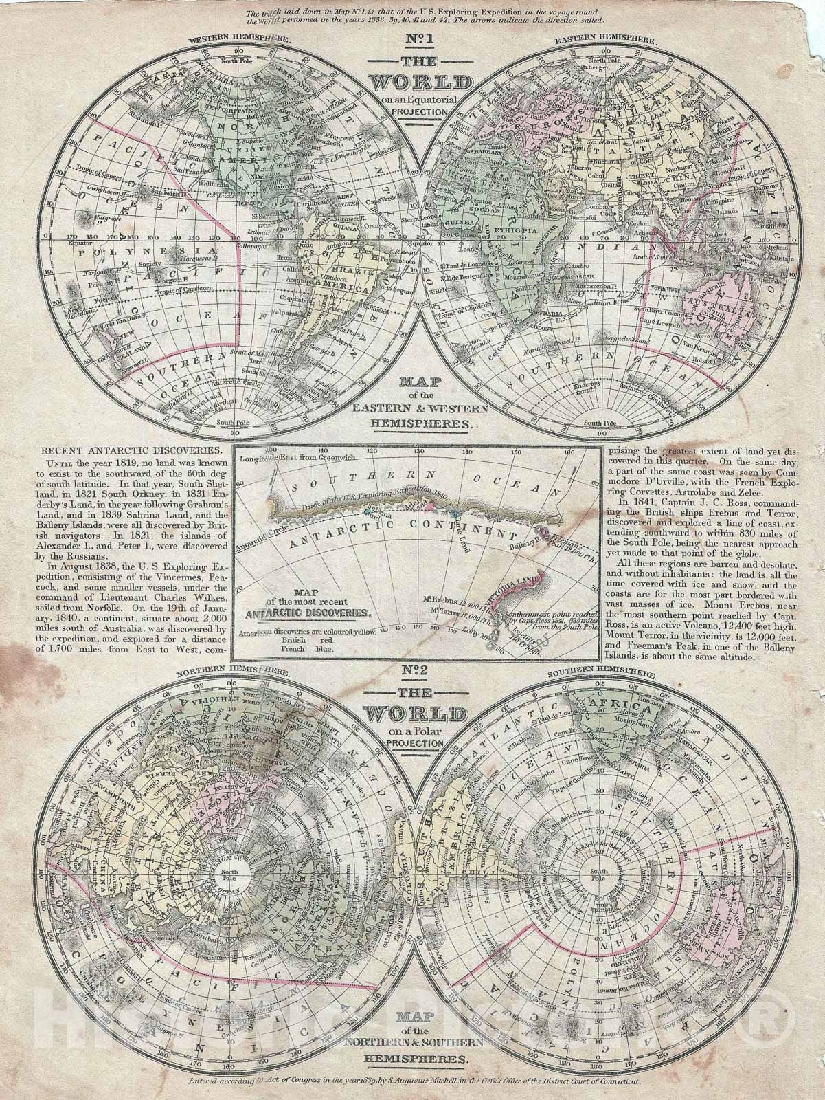 Historic Map : The World in Hemispheres "Northern, Southern, Eastern and Western", Mitchell, 1852, Vintage Wall Art