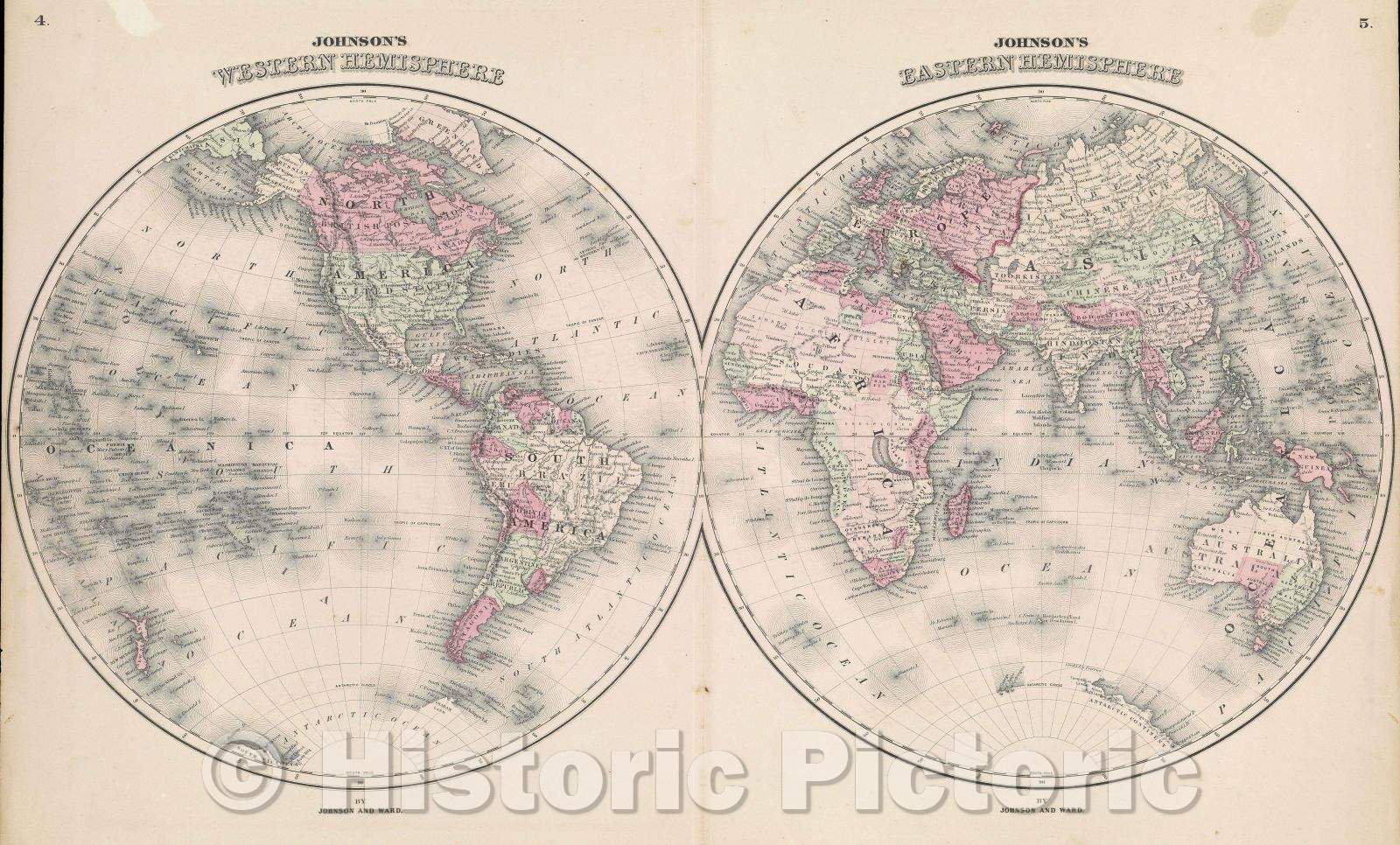 Historic Map : Johnson's Western Hemisphere, Johnson's Eastern Hemisphere, 1865 , Vintage Wall Art