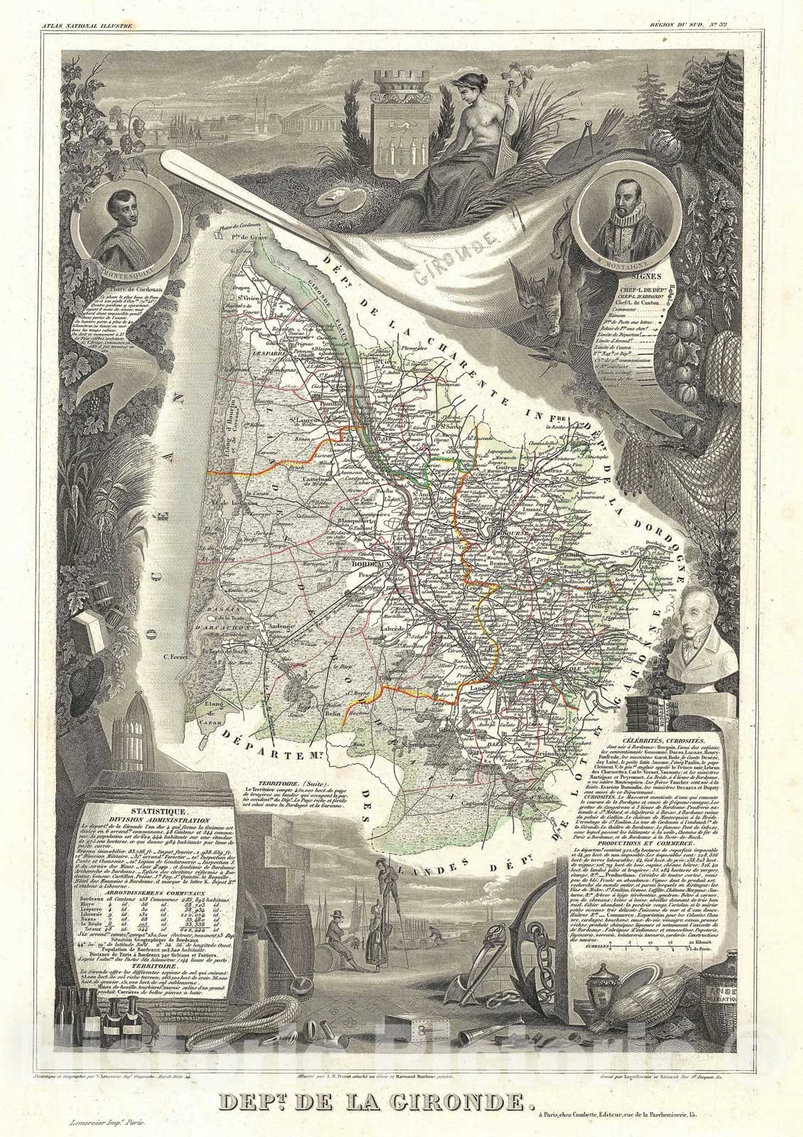 Historic Map : Gironde "Bordeaux Wine Region", Levasseur, 1852, Vintage Wall Art