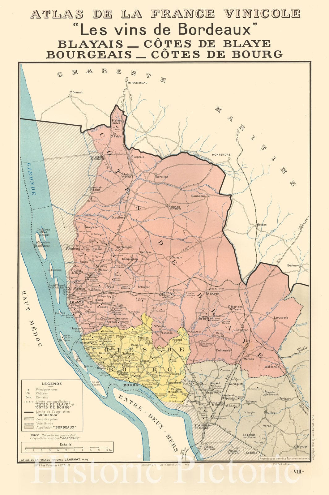 • .Historic Map - Les vins de Bordeaux Engre-Deux-Mers Graves de Vayres - Sainte-Foy-Bordeaux/Bordeaux Regional Maps, French Wine Country, 1941 - Vintage Wall Art